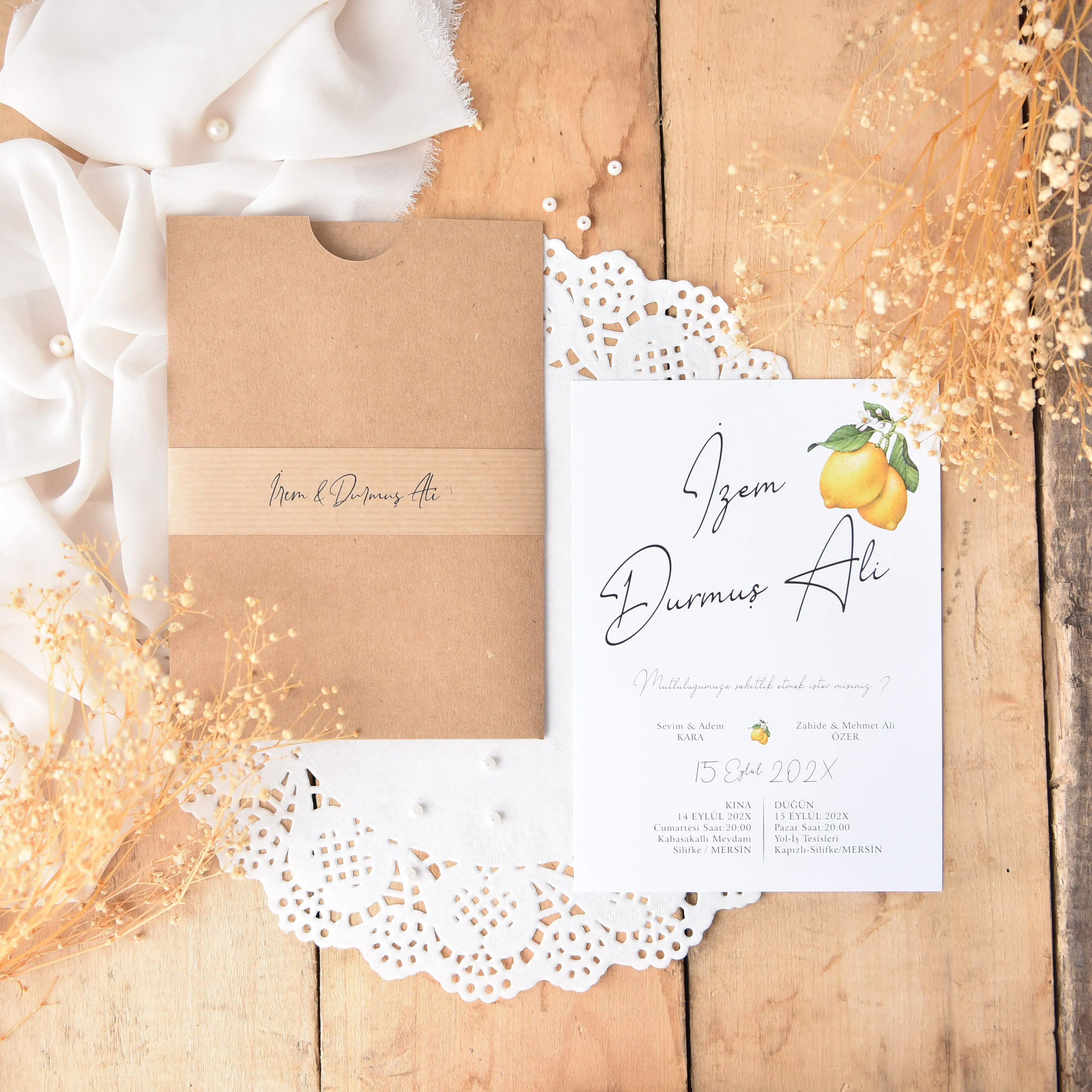 Davetiye kartlarının baskısı 300 gr kalınlığında 1.hamur kartona  dijital baskı tekniği ile üretilir. Davetiye boyutu 13 cm x 18 cm dir. Kraft  zarfların katlama kırımları tarafımızdan yapılmış halde gönderilir. Şeritlerin yapıştırılması için özel kesilmiş etiketler hazır gönderilir. Yazı alanları tamamen değiştirilebilmektedir. Kargo bedeli Yurtiçi kargo ile anlaşmalı olarak en uygun fiyat  ile gönderilmektedir. Ürünlerimiz en geç 3 iş gününde kargoya teslim edilmektedir. Bilgilerinizle davetiyeniz tasarlanıp tarafınıza whatsApp üzerinden gönderilecek olup, onayınız olmadan baskısı yapılmayacaktır. Şeridin üzerine gelin ve damat ismi baskısı ücretsizdir.